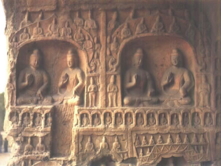 拱門高3.1米,寬2.25米。外側雕刻尖形門楣,內(nèi)飾忍冬紋。門外西側崩塌,經(jīng)近期修補,東側現(xiàn)存一力士,風化嚴重。拱門西壁下部風化嚴重。中部北側雕一圓拱龕,內(nèi)為坐佛。龕外兩側各雕一脅侍菩薩。龕楣內(nèi)雕七佛,龕兩側各雕五重千佛龕。中部南側雕一方形龕,內(nèi)為坐佛,龕外兩側各雕一脅侍菩薩。上層為方形帷幕龕,西壁雕坐佛坐于蓮座之上,兩側各雕一脅侍菩薩,南、北兩壁各雕一立佛,下雕蓮座。拱門東壁中、下部雕零散小龕,風化嚴重。上部北側雕三層佛塔一座,塔下雕一圓拱龕,內(nèi)為坐佛。南側雕一盝形帷幕龕,內(nèi)為交腳菩薩,龕南側崩塌,F(xiàn)存北側一思惟菩薩與飛天。龕楣方格內(nèi)雕坐佛。 |