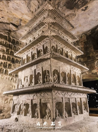 洞窟內(nèi)三級方形浮屠塔居中,塔面上刻出瓦筒、檐椽、斗拱等仿木建筑構件,層層瓦壟出檐,上層四角鏤空雕刻八角棱柱,形成了周匝回廊,為研究北魏建筑提供了實物依。