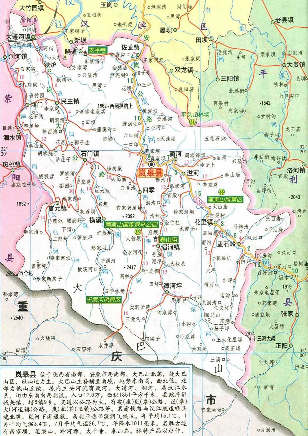 嵐皋縣位于陜西南部,大巴山北麓,南與重慶市城口縣接壤,北與安康市漢濱區(qū)、西與紫陽縣、東與平利縣相鄰,最高海拔2641米,最低海拔331米,北距安康市區(qū)71公里,全縣轄17個鄉(xiāng)鎮(zhèn)198個行政村,4.4萬戶,全縣總面積1956平方公里,人口17萬。其中農(nóng)業(yè)人口15.2萬人,境內以山地為主,屬典型的亞熱帶大陸性季風氣候。