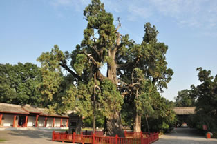 黃帝腳印石旁,有一棵漢武掛甲柏,又稱將軍柏,志載:“漢武帝征朔方還,掛甲于此樹。”樹干斑痕密布,縱橫成行,似有斷釘在內(nèi),是群柏之中最為奇特的一株。特別是每年清明節(jié)前,這棵古柏枝干上流出的柏液凝結(jié)為球狀,經(jīng)陽(yáng)光反射尤為壯觀,吸引著各地前來(lái)謁陵拜祖的人。然而清明節(jié)一過(guò),柏液中斷,古柏從枝到桿又恢復(fù)了原來(lái)密密麻麻的甲痕。