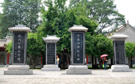 碑亭西前方,矗立著四塊石碑:香港回歸紀(jì)念碑、澳門回歸紀(jì)念碑、“臺(tái)灣光復(fù)致敬團(tuán)”祭黃帝陵文碑、慶祝香港回歸祖國(guó)十周年黃陵謁祖祭文碑。