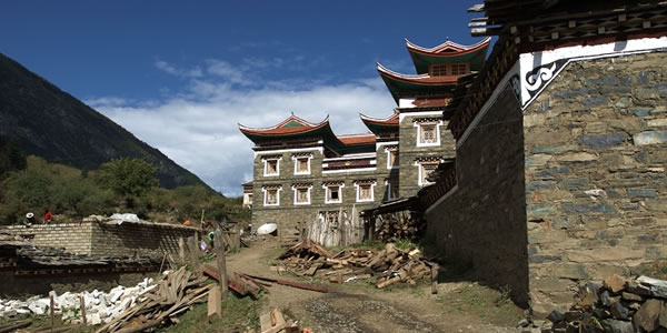 木雅人的房子中的一種形式與羌、嘉戎人的房子相似。“黑石為室”高數(shù)丈,一般三層,下層為養(yǎng)畜、中層住人、上層曬放柴草。住人的地方設有經(jīng)堂、茶房、臥室、涼臺、敞房和廁所。他們很少依山而居,一般房屋都筑在平地上。