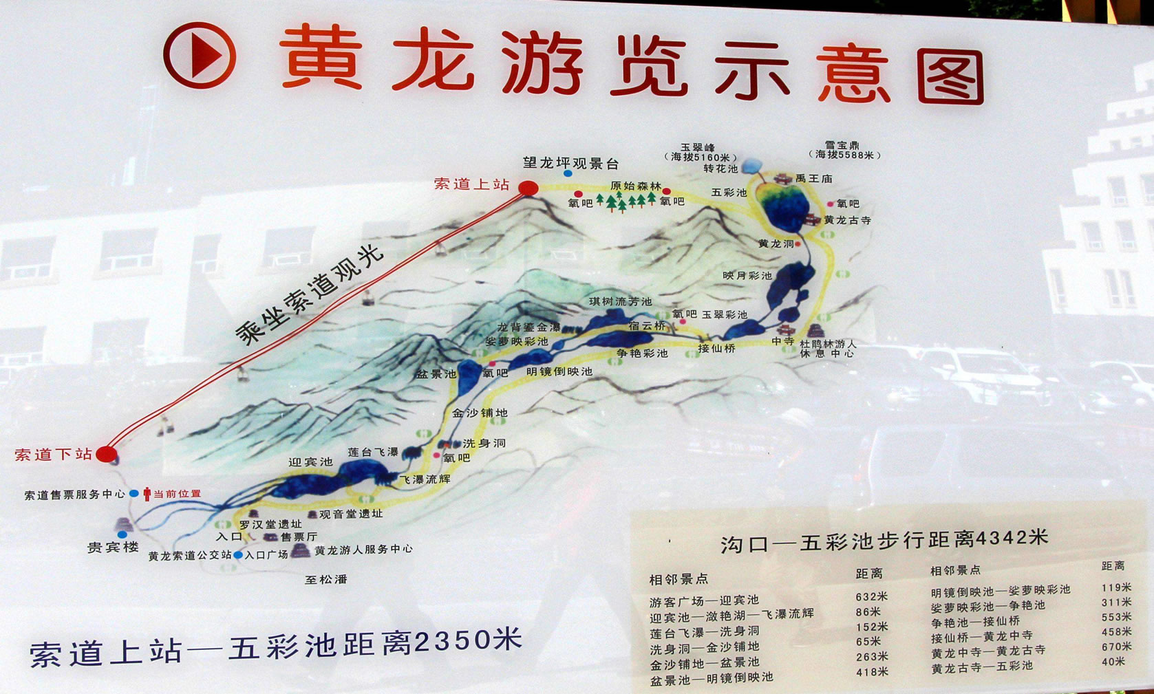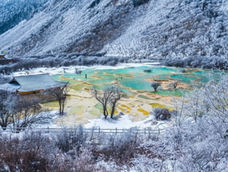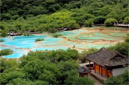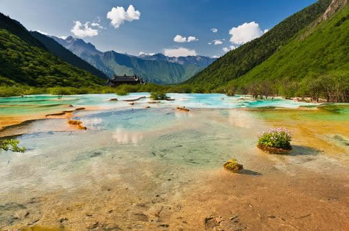 進(jìn)入黃龍景區(qū),首先看到的是一組精巧別致、水質(zhì)明麗的池群--迎賓池。池子大小不一,形狀奇特,色彩艷麗,錯(cuò)落有致,四周山岳環(huán)峙,林木蔥蘢,山間野花競(jìng)放,彩蝶飛舞。山間石徑曲折盤旋,點(diǎn)綴著觀景亭閣,倍添情趣。