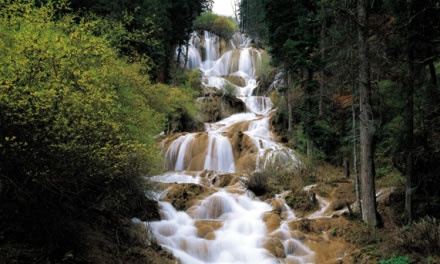 在牟尼溝風(fēng)景區(qū)原始大森林中,有一睽巨大的水流自104米高的臺(tái)階式鈣華化巖體上,洶涌咆哮著似自九天直傾而下,氣勢(shì)極為壯觀,它是我國最大的鈣化瀑布——扎嘎大瀑布。 扎嘎瀑布地處海拔3270米,瀑高93.2米,寬35米。上游是湖泊,下游為一串階梯式河床。上百個(gè)層層疊疊的鈣化環(huán)型瀑布玉串珠連,經(jīng)三級(jí)鈣化臺(tái)階跌宕而下,沖擊成巨大鈣化面而形成朵朵巨大白花,瀑聲如雷,聲形兼?zhèn)。在大瀑布第二階的鈣化壁上,有一“水簾洞”,洞口水流飛掛,洞內(nèi)氣象萬端。
