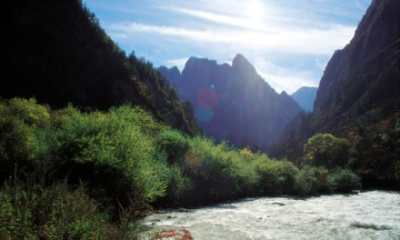 丹云峽以俊秀印峽谷風(fēng)光,成為黃龍的“五絕”之一。它擁有豐富的樹種、灌木和花草,是植物愛好者的天堂。丹云峽景區(qū)起子玉筍群峰,止于扇子洞,綿延18.5公里,落差1300米,峰谷高差為1000至2000米。這里冬天一片雪白,夏天山林翠綠,尤其是春天漫山遍野的紅杜鵑、秋天一路楓葉紅遍峽谷,那情景仿佛夕陽之下的火燒云從天而降,丹云峽因此而得名。山生云,樹生風(fēng),丹云峽幾乎每天都有云霧從林中升起,繚繞山間,時(shí)隱時(shí)現(xiàn)。丹云峽內(nèi)森林密布,發(fā)源于雪寶頂?shù)母⒔,在峽內(nèi)奇石怪巖的夾逼中奔游林間,好似一條白龍搖頭擺尾,與身邊的黃龍遙相呼應(yīng)。
