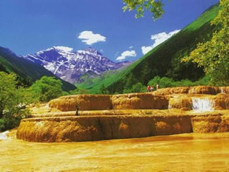 位于岷山主峰雪寶頂,下臨涪江源流——涪源橋,是一條長7.5公里、寬1.5公里的緩坡溝谷。溝內(nèi)布滿乳黃色巖石,遠(yuǎn)望好似婉蜒于密林幽谷中的黃龍,黃龍溝名即來源于此。明代(公元1368~1644年)在此修建了黃龍寺,用以奉祀黃龍。黃龍溝以它“奇、絕、秀、幽”的自然景觀而蜚聲中外,它酷似中國人心目中“龍”的形象,藏民稱之為“東日·瑟爾磋”,意為東方的海螺山(指雪寶頂)、金色的海子(指黃龍溝),并沿襲著一年一度盛況煊赫、波及西北各省區(qū)各族民眾參加的轉(zhuǎn)山廟會(huì)。 黃龍溝連綿分布鈣化段長達(dá)3600米,最長鈣化灘長1300米,最寬170米;彩池?cái)?shù)多達(dá)3400余個(gè);邊石壩最高達(dá)7.2米。