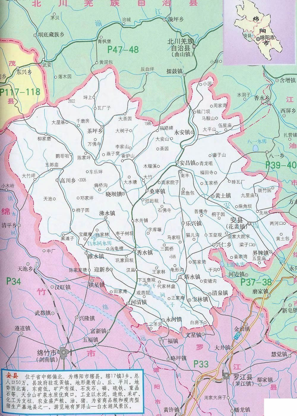 安縣位于四川盆地西北部,距成都110公里,距綿陽(yáng)科技城10公里。縣境山丘壩兼有,幅員1404平方公里??cè)丝?0萬(wàn)人,轄4鄉(xiāng)16鎮(zhèn)。安縣氣候宜人,生態(tài)環(huán)境優(yōu)美。屬亞熱帶濕潤(rùn)季風(fēng)氣候,氣候溫和,雨量充沛,四季分明,日照充足,無(wú)霜期長(zhǎng)。年均氣溫16.3℃,年均降水量1260mm,空氣質(zhì)量常年達(dá)國(guó)家二級(jí)標(biāo)準(zhǔn),森林覆蓋率達(dá)42%。縣內(nèi)交通四通八達(dá),人流、物流進(jìn)出快捷方便 ,現(xiàn)代通訊覆蓋全縣,并開(kāi)通了ADSL業(yè)務(wù)和高速寬帶網(wǎng)絡(luò),光纖有線(xiàn)電視遍布城鄉(xiāng)。自然資源豐富,有水泥石灰石、磷礦、煤、硫鐵礦、重晶石、鋁土礦等礦產(chǎn)資源29種,儲(chǔ)量豐富;有動(dòng)物資源948種,其中大熊貓、金絲猴等國(guó)家一、二級(jí)保護(hù)動(dòng)物77種;有植物資源814種,其中銀杏、珙桐等國(guó)家一級(jí)珍稀植物及棗皮、杜仲、烏藥等中藥材資源100多種。工業(yè)基礎(chǔ)良好。電子、建材輕化、能源、化工、食品等支柱工業(yè)日益壯大。農(nóng)業(yè)生產(chǎn)條件優(yōu)越,農(nóng)村經(jīng)濟(jì)持續(xù)發(fā)展。雜交水稻制種、優(yōu)質(zhì)水稻、無(wú)公害蔬菜、水果、無(wú)規(guī)定疫病畜禽養(yǎng)殖、水產(chǎn)、蠶桑、魔芋、棗皮等農(nóng)業(yè)產(chǎn)業(yè)化經(jīng)營(yíng)蓬勃發(fā)展。