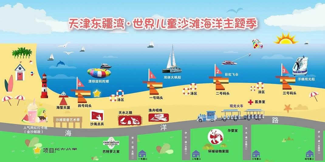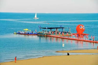 景區(qū)還將增添激情水上飛碟、快艇漂移、水上沙發(fā)、水上UU船、帆船、海上滑梯、海上蹺蹺板等數(shù)十項(xiàng)大型游樂設(shè)施,讓這里真正成為海上“迪士尼”。作為配套設(shè)施,在人工海灘西側(cè)修建濱海路,全長1.3公里,道路寬24米,為景區(qū)內(nèi)步行觀景道路,道路兩側(cè)綠化面積約6700平方米。綠化廣場總面積12萬平方米,景區(qū)停車場總面積約4700平方米。景區(qū)設(shè)置為沙灘親水區(qū)、沙灘游泳休閑區(qū)、水上運(yùn)動(dòng)休閑中心和水上休閑娛樂區(qū)。其中,位于沙灘游泳休閑區(qū)已經(jīng)建成的海景會(huì)所,是目前國內(nèi)北方最大的單體木結(jié)構(gòu)海景酒店會(huì)所,設(shè)有餐飲、住宿、淋浴、商務(wù)、娛樂等設(shè)施,并提供有地道的天津狗不理包子。另外,會(huì)所周邊正在建設(shè)游艇會(huì)所、五星級酒店、運(yùn)動(dòng)廣場、低密度住宅、高爾夫球場等設(shè)施。配套服務(wù)設(shè)施將逐步完善。