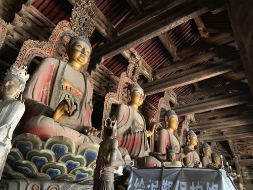 觀音閣內(nèi)中央的須彌座上,聳立著一尊高16米的泥塑觀音菩薩站像,菩薩頭部直抵三層的樓頂。因其頭上塑有十個小觀音頭像,故又稱之為“十一面觀音”,菩薩面容豐潤、慈祥,兩肩下垂,軀干微微前傾,儀態(tài)端莊,似動非動。觀音塑像兩側(cè)各有一尊脅侍菩薩塑像,塑像是遼代的原塑,雖制作於遼代,但其藝術(shù)風(fēng)格類似盛唐時期的作品,是我國現(xiàn)存的最大的泥塑佛像之一。