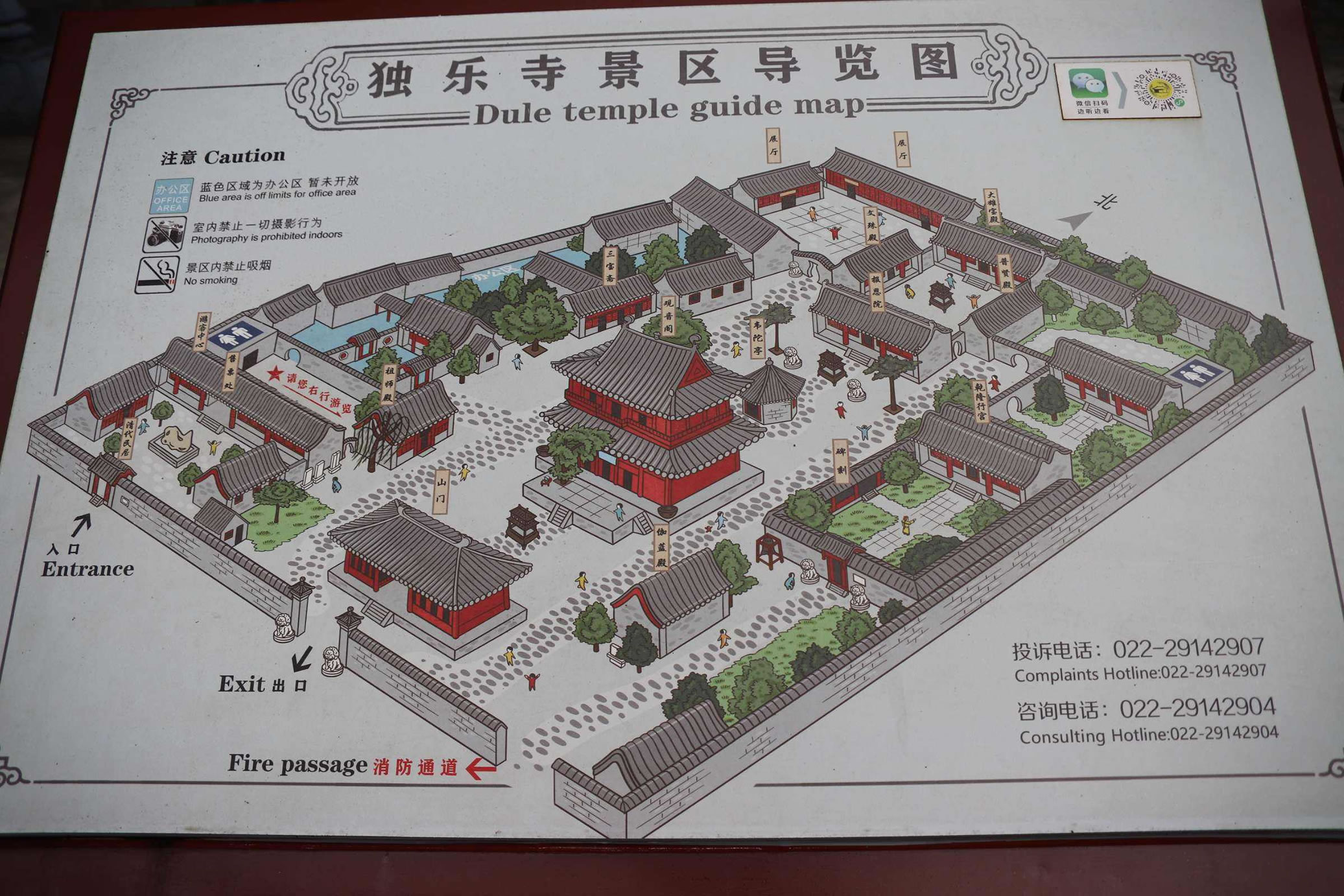 韋馱亭位于觀音閣北面,高約5米,寬約4米,是一座明代修建的攢尖頂八角亭,亭內(nèi)韋馱像高約3米,威猛莊嚴(yán),甲胄鮮明,持降魔桿。韋馱原為古印度婆羅門教天部神,在佛涅盤時,捷疾鬼盜取佛牙一雙,韋馱急追取回,后來便成為佛教中的護衛(wèi)天神。亭內(nèi)韋馱像,身著盔甲,表情肅穆,雙手合十,懷抱金剛杵。據(jù)說韋馱的不同姿勢對于行腳僧而言有著不同的意義,只要看見寺內(nèi)的韋馱像雙手合掌,表示寺廟里歡迎,路過和尚盡可大搖大擺進去,白吃白。灰俏砧浦舻,表示寺廟不歡迎掛單和尚。