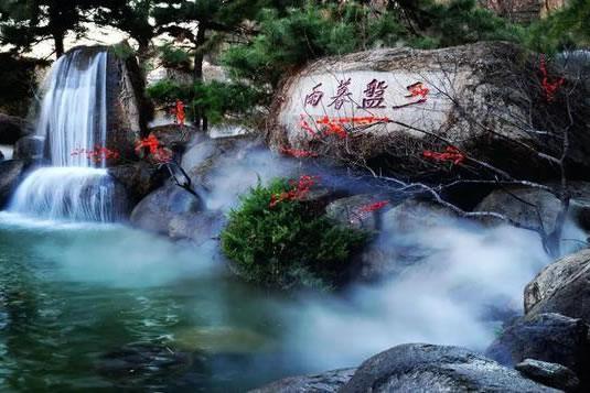 過(guò)仙人橋,迎面是石徑流泉。飛瀑沿山壁陡瀉,下自成溪,沿著蜿蜒崎嶇的山谷徐徐流下,碧波蕩漾.水流遇溪頭之巨石而中分,清澈不濁。