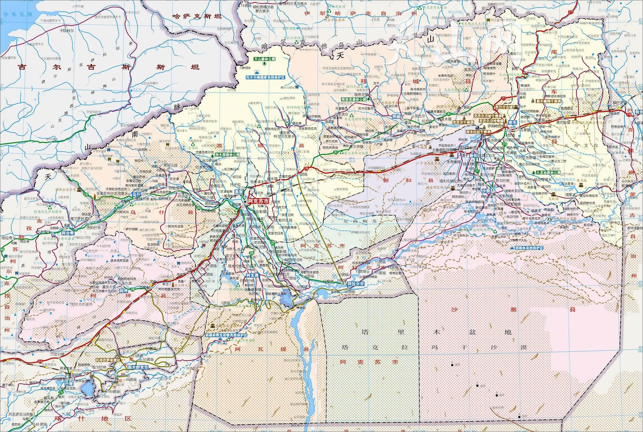 阿克蘇地區(qū)轄2個縣級市、7個縣: