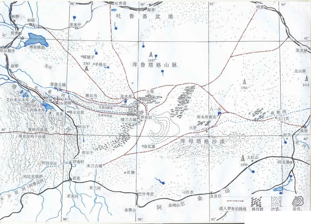 至清代末葉,羅布泊水漲時(shí),僅有“東西長(zhǎng)八九十里,南北寬二三里或一二里不等”,成了區(qū)區(qū)一小湖。