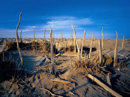 羅布泊干涸后,周圍生態(tài)環(huán)境發(fā)生巨變,草本植物全部枯死,防沙衛(wèi)士胡楊樹成片死亡,沙漠以每年3~5米的速度向羅布泊推進(jìn),很快和廣闊無(wú)垠的塔克拉瑪干沙漠融為一體。羅布泊從此成了寸草不生的地方,被稱作“死亡之!。