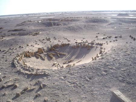 位于太陽(yáng)墓地西側(cè),在古河道北岸的一片臺(tái)地上,有成片的株距相等、行距相同、樹干尺余粗的枯死的胡楊林。這成排成行的枯樹,帶有明顯的人工營(yíng)造的特征。