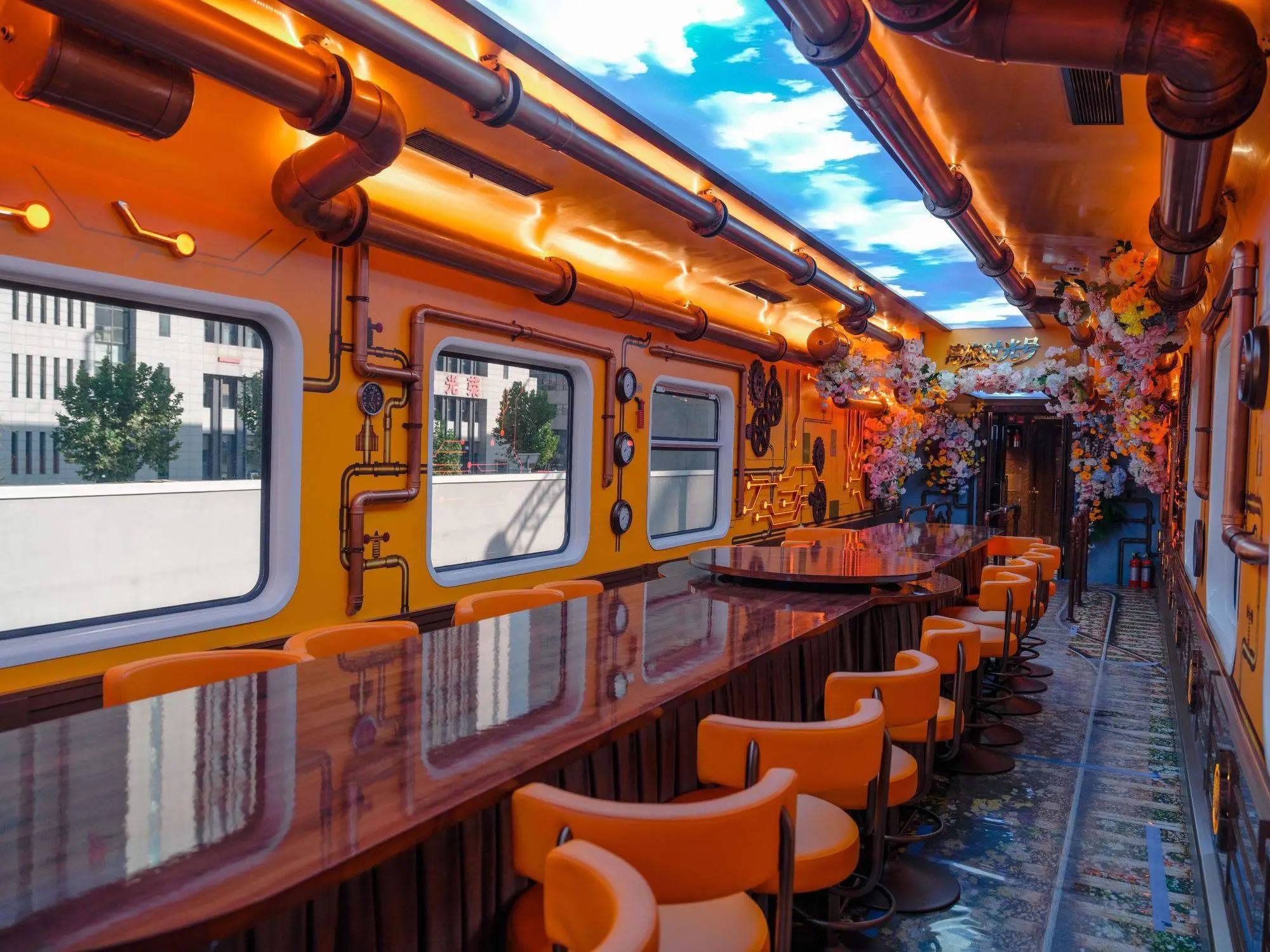 列車共設(shè)10節(jié)主題鮮明的特色車廂:分別為復(fù)古客座車廂、蒙太奇幻境互動(dòng)演藝車廂、珍奇花園俱樂(lè)部車廂、沉浸式時(shí)空穿梭機(jī)車廂以及專屬VIP車廂,均以沉浸式戲劇化空間為理念,將座椅拆分重組,每節(jié)車廂形成互動(dòng)或演藝區(qū),配備移動(dòng)舞臺(tái)、隱藏?zé)糗壓铜h(huán)繞音響。座椅、地面及軟裝材料兼顧安全與舒適,同時(shí)配備冷暖氣系統(tǒng)、移動(dòng)吧臺(tái)和多功能儲(chǔ)物柜,提供全方位的互動(dòng)體驗(yàn)。