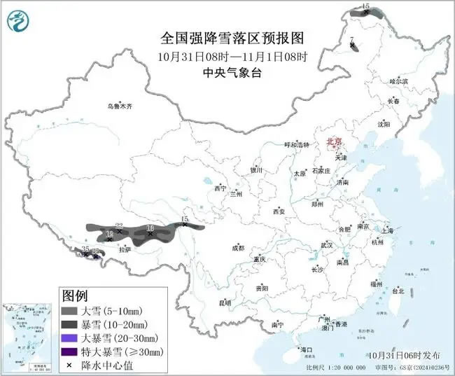 中央氣象臺10月31日6時(shí)繼續(xù)發(fā)布暴雪藍(lán)色預(yù)警:預(yù)計(jì)10月31日8時(shí)至11月1日8時(shí),西藏中東部和西南部、川西高原北部、黑龍江西北部、內(nèi)蒙古東北部等地部分地區(qū)有大到暴雪,其中,西藏中部局地有大暴雪,西藏西南部局地有大暴雪或特大暴雪(30~35毫米)。上述部分地區(qū)新增積雪深度4~8厘米,山區(qū)局地可達(dá)15厘米以上。