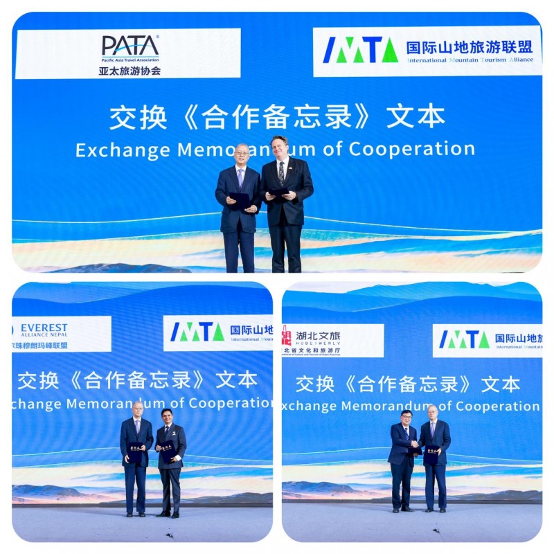 國際山地旅游聯(lián)盟副主席兼秘書長何亞非分別與亞太旅游協(xié)會主席彼得·西蒙(Peter Semone)、尼泊爾珠穆朗瑪峰聯(lián)盟主席蘇大山·尼泊爾(Sudarshan Nepal)、湖北省文化和旅游廳副廳長徐勇交換合作備忘錄,旨在通過資源共享、優(yōu)勢互鑒,為全球旅游業(yè)可持續(xù)增長注入新動能、貢獻(xiàn)實踐力量。