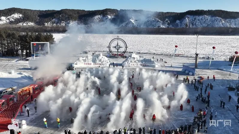 七星廣場(chǎng)上,備受期待的“極寒奇觀秀”在七星廣場(chǎng)震撼上演,身披紅斗篷的居民和游客組成一個(gè)巨大的“北”字造型,隨著指令下達(dá),他們同步將滾燙的熱水空中潑灑,在零下三十多攝氏度的極寒空氣中瞬間凝結(jié)成漫天冰晶,銀絮紛飛、弧線交織、光影交錯(cuò),構(gòu)成一幅壯闊的極地冰雪畫卷,F(xiàn)場(chǎng)快門聲此起彼伏,大家紛紛用鏡頭記錄這個(gè)奇幻瞬間。