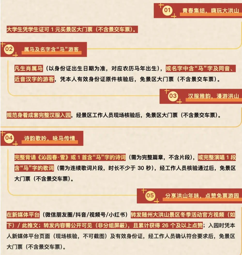 此外,隨州大洪山風景名勝區(qū)發(fā)布的消息還顯示,規(guī)范身著成套完整漢服入園,經(jīng)景區(qū)工作人員現(xiàn)場核驗后,免景區(qū)大門票(不含景交車票);完整背誦《沁園春·雪》或 1 首含“馬”字的詩詞(需為完整篇章,不含片段),或完整演唱 1 段含“馬”字的歌詞(需為連續(xù)歌詞片段,時長不少于 30 秒),經(jīng)工作人員核驗通過后,免景區(qū)大門票(不含景交車票)。