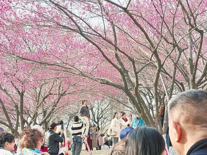 雖是工作日午后,坡上已有數(shù)百位市民游客漫步賞玩。花影人潮中,除了專程而來的攝影愛好者架起“長槍短炮”,更有許多家庭扶老攜幼,在梅林間游玩、野餐。曾是約拍行業(yè)淡季的隆冬時節(jié),也成了旺季。“花期比往年早了近一個月,好幾個周末的‘約拍’都排滿了。”攝影愛好者周女士邊調(diào)整鏡頭邊說。據(jù)攝影師“四葉草”介紹,周末這里人流如織,即便今天是工作日,前來拍照的游客依然不少。“目前‘梅花坡’花開得最盛,大家都搶著來出片,競爭壓力不小。眼下的梅花是開年第一波熱度。”