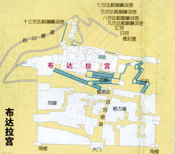 布達拉宮的基本面貌,主要是公元17世紀五世達賴喇嘛時期重建的白宮及其圓寂后修建的紅宮,“此后歷代達賴又相繼擴建,終成布達拉宮今日之規(guī)模。”