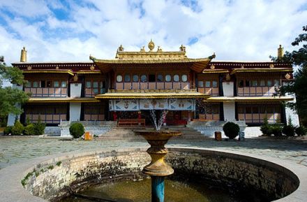 宮殿共三層,一層是經(jīng)堂,前面有一個(gè)600平方米的石板院子,二層有羅漢殿,護(hù)法殿和達(dá)賴閱經(jīng)室,三層是達(dá)賴接見(jiàn)僧俗官員的地方。園中樹(shù)木茂盛,花卉繁多,更有亭臺(tái)池榭,林竹山石,珍禽異獸等,宮前長(zhǎng)廊和室內(nèi)雕梁畫棟。