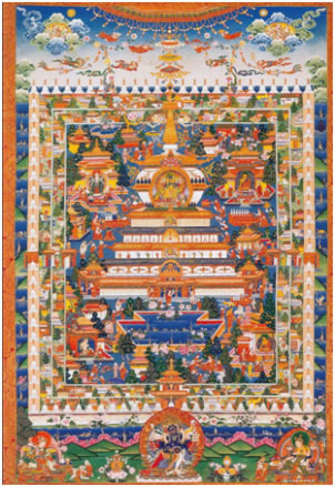 除佛像、佛塔外,唐卡收藏也是一大亮點(diǎn)。羅布林卡珍藏了大量18到20世紀(jì)勉唐畫派、欽則畫派和嘎赤畫派的各類作品。早期唐卡著名的有覺(jué)仲師徒像、帕木竹巴·多吉杰布像、印度尊者比瓦巴、那若巴像。其中覺(jué)仲師徒像唐卡,描寫的是印度尊者,噶當(dāng)派始祖阿底峽向貼身弟子仲敦巴(師徒合稱“覺(jué)仲”)傳授佛法的故事。畫面中心主尊阿底峽頭戴錐形遮耳帽,身披袈裟,雙手結(jié)說(shuō)法印,給身旁仲敦巴講法,仲敦巴著藏式袍服,結(jié)跏趺坐,側(cè)身聆聽(tīng)大師教誨。畫面上、下分別繪有如來(lái)、藥師、觀音、度母諸佛及繪畫施主像,人物刻畫逼真、栩栩如生,背景以朱砂填色,輪廓用金線勾勒。這件13世紀(jì)繪制的“赤唐”作品,十分稀有,彌足珍貴。另外,在收藏諸多的嘎赤畫派作品中,以84位印度大成就者唐卡最具特色。這些唐卡的畫面,不同以往其他畫派作品,構(gòu)圖較為簡(jiǎn)潔,色彩淡雅。人物形態(tài)被描繪的極為夸張,塑造了一個(gè)個(gè)特殊而詼諧逗趣的大成就者形象。這種一反常態(tài)的畫風(fēng)作品,在外邊難得一見(jiàn)。還有以唐卡形式繪制的《四部醫(yī)典系列掛圖》,收藏也比較完整。系列掛圖,藏族稱為“曼唐”,它是以彩色連環(huán)畫形式系統(tǒng)描述了藏醫(yī)藥學(xué)的基本理論,人類解剖構(gòu)造,生理功能、疾病診斷治療方法,各種藥物種類以及人類如何養(yǎng)生保健、飲食搭配等內(nèi)容。“曼唐”制作完善于清代五世達(dá)賴?yán)锇⑼迳<未雸?zhí)政時(shí)期。最早成79幅,1916年十三世達(dá)賴?yán)锪钊擞衷鲅a(bǔ)了一幅“歷代西藏名醫(yī)圖”,形成80幅。這批系列掛圖,被視為標(biāo)準(zhǔn)藍(lán)本,完整保存在羅布林卡內(nèi)。