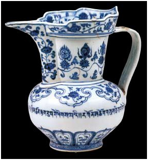 明宣德時(shí)期(公元1426年--1435年)贈(zèng)送的青花纏枝蓮紋僧帽壺,高23cm,底徑9cm。該壺是仿藏傳佛教僧人的僧帽所制,故稱“僧帽壺”。壺的通體飾青花紋樣,腹部書寫一圈藏文,意為“晝吉祥、夜吉祥、正午吉祥、晝夜吉祥、三寶吉祥”。但這圈銘文中的藏文字母和分隔符號(hào)書寫有誤,可見(jiàn)這是不通藏文的漢族工匠仿書。足墻飾美麗的卷草紋,器底青花雙圈書寫兩行六字“大明宣德年制”。宣德青花瓷以其古樸典雅的造型,晶瑩艷麗的釉色,多姿多彩的紋飾聞名于世。宣德時(shí)期西藏與內(nèi)地往來(lái)綿密,大量的青花瓷做為皇帝贈(zèng)品傳入西藏。西藏上層為保存這些瓷器不致受損,還用金屬或皮革制成瓷套盛裝。此件瓷壺從造型到紋飾,多含西藏元素,顯然它是朝廷命景德鎮(zhèn)官窯專門燒制贈(zèng)予西藏上層的。
