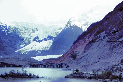 離開川藏公路,過了新建的橫跨額公藏布江公路橋后,只見一條兩面均是懸崖絕壁的峽谷,沿著小河修建的村道僅能通過一輛車,再走幾公里后,突然出現(xiàn)大片寬闊的谷地,遠(yuǎn)處兩條壯觀的冰瀑布掛在雪峰與森林之間,猶如兩道由天而下的巨大銀幕……要與米堆冰川做近距離接觸的話,還要徒步走進層林盡染的森林,翻越三道冰川運動留下的終磧垅。當(dāng)走上第三個終磧垅時,一個冰湖出現(xiàn)。冰湖的另一端有一道寬近兩米、高達(dá)十?dāng)?shù)米的斷裂的冰舌,發(fā)出幽幽的藍(lán)光。從天而下的冰瀑布在陽光下閃著銀色的光芒,近800米的落差讓人感到一陣暈眩。一陣陣從冰川上吹來的寒風(fēng)迎臉撲來,在強烈的陽光下,還是讓人不寒而栗。