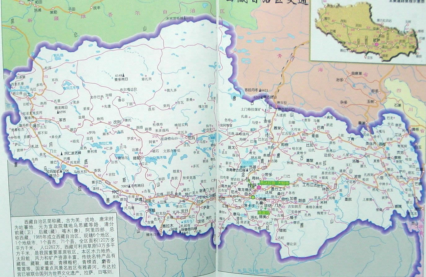 西藏,古為羌、戎地。唐、宋時(shí)為吐蕃地。元為宣政院所轄烏思、藏、納里速古魯孫等三路宣慰使司地。明代依元制,仍稱(chēng)“烏思藏”。清代分為“衛(wèi)”(前藏)、“藏”(后藏)、 “喀木”(康)、“阿里”四部,因在中國(guó)西境,故總稱(chēng)“西藏”!拔鞑亍币辉~,最早見(jiàn)于清康熙二年(公元1663年)。1951年和平解放西藏。1956年將原西康省昌都地區(qū)并入西藏。 1965年9月9日,建立西藏自治區(qū)!