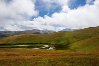 忽就飄過了山頭,轉(zhuǎn)眼又是彩虹當(dāng)空,縹縹渺渺、臻于純美;進入冬季,它變得深沉而厚重起來。草山的云和霧很難找到一個較為明白的分界,霧自溝溝凹凹鉆出來,繞山而起,云層的底端卻就在頭頂!“白云回望合,青靄入看無”。只有到了大海草山,方能體會到王維這句詩的意境。