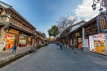 復(fù)興路是大理古城主干道和最繁華的街道,連接南城門和北城門,總長(zhǎng)1500米,路面為麻塊石路面,是古城南北方向最長(zhǎng)的主干道。復(fù)興路兩邊商鋪保持了民清時(shí)期的建筑風(fēng)格,是大理古城主要商業(yè)街道。