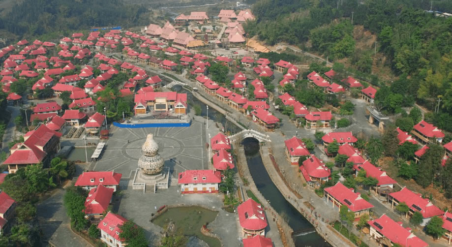葫蘆小鎮(zhèn)位于滄源縣城西南3千米處,于2013年建設(shè)完工,小鎮(zhèn)占地面積202畝,共有民居180戶,建筑風格保留佤族民居獨有的建筑特點,外形特征為紅色弧形屋頂及屋角裝飾交叉角。小鎮(zhèn)180棟紅色弧形屋頂特色民居與文化墻、噴水葫蘆、打歌廣場、寨心磚、葫蘆塔、佤王府等佤族特色建筑巧妙地融合在一起。