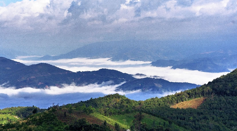 十層大山,也稱(chēng)為寬羅珊山,是一座座落于中國(guó)云南省、越南奠邊省及老撾豐沙里省的山峰,為三國(guó)邊界的交界點(diǎn),海拔1864米。山頂被稱(chēng)為雞鳴三國(guó),豎立有一塊花崗巖界碑,分別書(shū)寫(xiě)中國(guó)、越南、老撾3國(guó)文字的界碑面向著各國(guó)的領(lǐng)土。