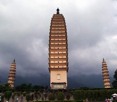 三塔相傳建于南詔保和時期,三塔之旁原有規(guī)模宏大的崇圣寺。據(jù)《南詔野史》、《自古通記》等史籍記載,寺基方7里,建于南詔第十主豐佑,保和十年至天啟元年(公元834至840年)。經(jīng)歷了千年滄桑和風雨剝蝕,崇圣寺終毀于清咸豐年間,如今惟留三塔。近年來曾在塔頂發(fā)現(xiàn)南詔、大理中時期的重要文物600余件。