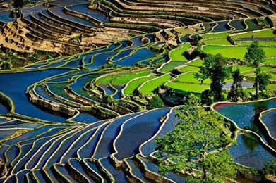元陽梯田,位于云南省紅河州元陽縣的哀牢山南部,是哈尼族人世世代代留下的杰作。元陽梯田是紅河哈尼梯田的核心區(qū)。紅河哈尼梯田是以哈尼族為主的各族人民利用特殊地理氣候同墾共創(chuàng)的梯田農(nóng)耕文明奇觀,規(guī)模宏大,氣勢磅礴。元陽哈尼族開墾的梯田隨山勢地形變化,坡緩地大則開墾大田,坡陡地小則開墾小田,甚至溝邊坎下石隙也開田,因而梯田大者有數(shù)畝,小者僅有簸箕大,往往一坡就有成千上萬畝。