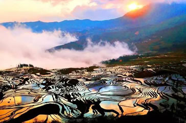 紅河哈尼梯田位于云南南部,遍布于紅河州元陽、紅河、金平、綠春四縣,總面積約100萬畝,僅元陽縣境內(nèi)就有17萬畝梯田。元陽梯田是哈尼族人1300多年來生生不息地“雕刻”的山水田園風(fēng)光畫。2013年(癸巳年)6月22日在第37屆世界遺產(chǎn)大會(huì)上紅河哈尼梯田被成功列入世界遺產(chǎn)名錄,成為中國第45處世界遺產(chǎn)。