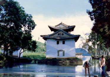 九苞鳳城,是指市區(qū)及城北的舞鳳山,土色粉紅,形同九頭丹鳳凌空翱翔。山溝梁王山的中支逼迫而來(lái),如鳳首覽輝,左右兩山其勢(shì)如同鳳凰展翅。澂江古城,城墻高一丈九尺,方圓五華里零三分,門(mén)樓巍峨,南北的大街如書(shū)軸,東西的房屋相連,如打開(kāi)的書(shū)卷,故有丹鳳銜書(shū)之稱(chēng)。