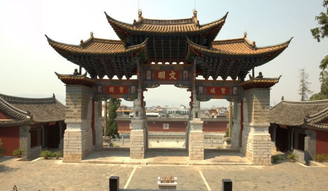 位于通海縣城南隅、座落于秀山之麓,南北向。為中軸線分幢迭起單體組合式古建筑群,由紅墻(長(zhǎng)65米、厚1.9米、高8米)泮池、文明坊、忠烈祠、節(jié)孝祠、大城門、鄉(xiāng)賢、名宦祠、東廡、西廡、大城殿、鐘鼓樓、崇圣祠、尊經(jīng)閣組成,總占地1.2萬(wàn)平方米。通海文廟始建于元代,于明萬(wàn)歷遷建今址,現(xiàn)存建筑為清初康熙、雍正之物。清朝時(shí)期,在通海廟學(xué)中曾經(jīng)培養(yǎng)出朱嶟(禮部尚書),公孫翰林的董玘、董健,有名書法家闞禎兆等。通海文廟于1998年被省政府公布為“第五批文物保護(hù)單位”。