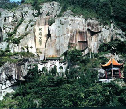 順石級而上,便可見一處寬敞的石廳。廳中有一巨石雕刻成的大碗。大碗直徑2.12米,可裝2噸多水,碗中有龍頭龜身的吉祥物。此碗已被列入世界吉尼斯記錄。從石廳左轉(zhuǎn),到達(dá)另一石廳。此廳存放著巨型石刻古錢幣。石青色,內(nèi)徑為0.8米,刻有“政和通寶”四字。從巖頂隙中滲出的清泉涓涓而下,剛巧穿過錢幣中央,因此古錢幣中央終年泉水滿盈。