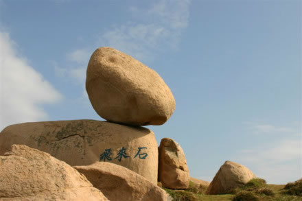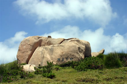 能以人力或風(fēng)力推動而搖擺的大巖石,在各地勻有發(fā)現(xiàn)。南麂三盤尾石門旁的風(fēng)動巖卻別有情趣。此石高約5.5米,直徑4米,形如銅鼓,卻裂成兩瓣,一瓣是“靜如處子”分外端莊;另一瓣,凡遇上5級以上大風(fēng),便自行搖動,可謂“動似脫兔”,還以發(fā)出悅耳聲響,宛如海底傳來的進(jìn)軍號角。倘若無風(fēng)時,那只得勞駕游客,憑力氣去推、去搖。面對風(fēng)動巖了,聯(lián)想起佛教中關(guān)于“風(fēng)動也,情動也,見仁者自己心動”的“因緣和合”典故,似乎明白了自然景觀中也充滿生活哲理。此巖其自身根基不穩(wěn),加上風(fēng)的外力,便顯得搖擺不定。