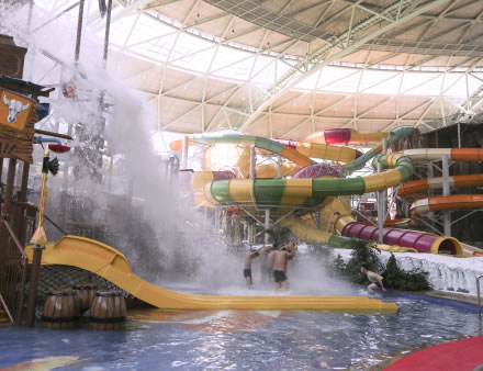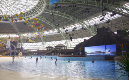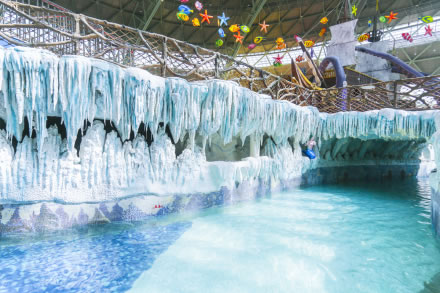 水之王國場館擁有室內(nèi)沙灘、超大型組合滑道(異域湍流)、冰谷漂流等項目設(shè)施。