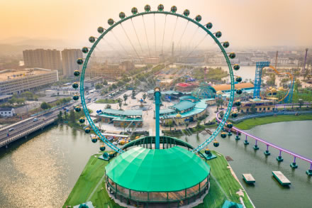建設(shè)總高度達(dá)88米,掛有42個太空艙。從遠(yuǎn)處看像是五彩繽紛的巨大風(fēng)車在緩緩轉(zhuǎn)動,又似一顆顆晶瑩的珍珠鑲嵌于大轉(zhuǎn)盤之上。