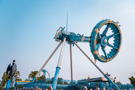 天旋地轉(zhuǎn),陀螺儀類型游樂設(shè)施,高度16米,同時乘坐26人。當(dāng)轉(zhuǎn)臂與搖臂的轉(zhuǎn)速、旋轉(zhuǎn)方向在連續(xù)變化時,座椅以前后、上下、左右不同方向旋轉(zhuǎn)不斷變換狀態(tài),搖擺、顛簸、翻滾……使乘客如置身于太空自由翱翔。